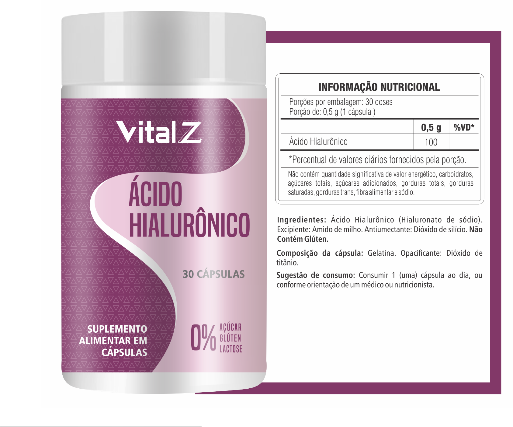 Pele hidratada, firme e saudável de dentro para fora. O Ácido Hialurônico da VitalZ contribui para a elasticidade, redução de linhas finas e aparência jovem da pele. Também ajuda na saúde ocular e acelera a recuperação de tecidos e feridas.