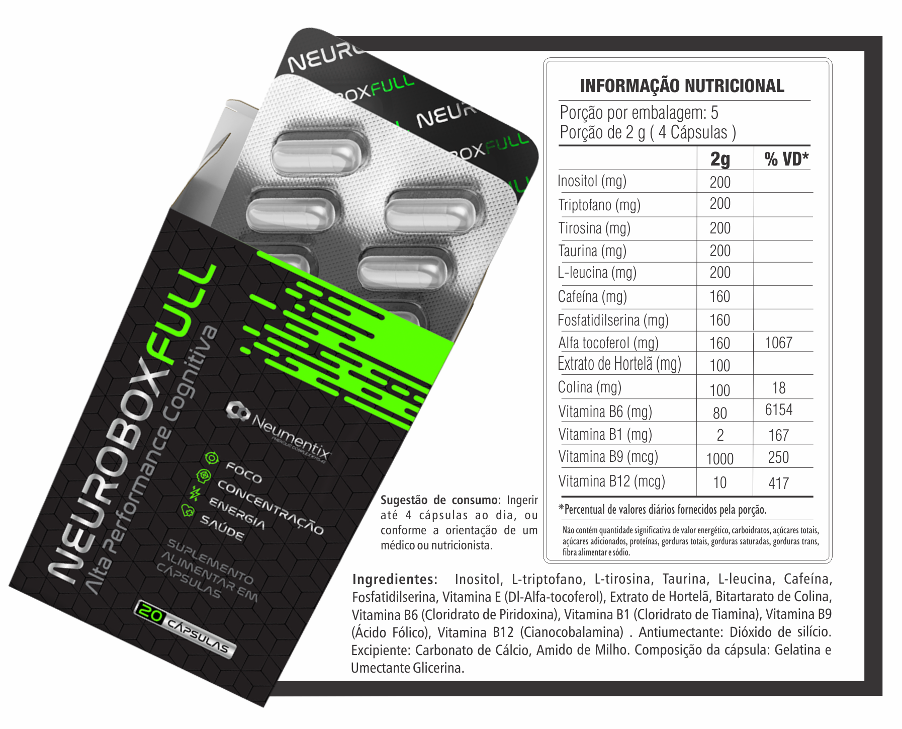 Com 14 ativos como Inositol, Triptofano, Cafeína, Vitaminas do complexo B e o exclusivo Neumentix, um extrato patenteado de hortelã que estimula a neurogênese!